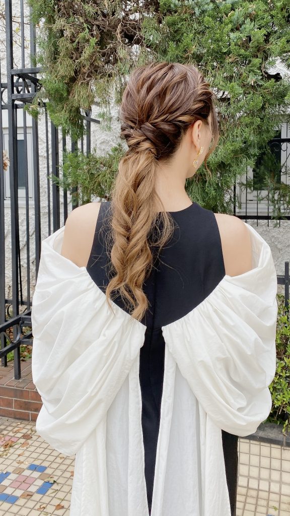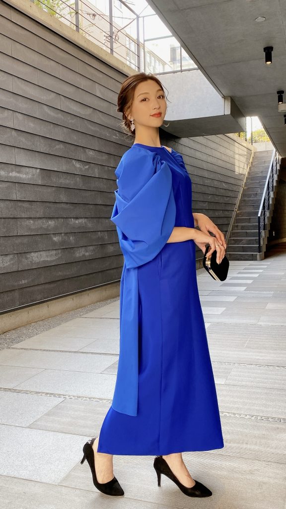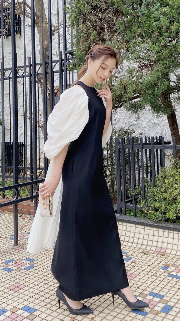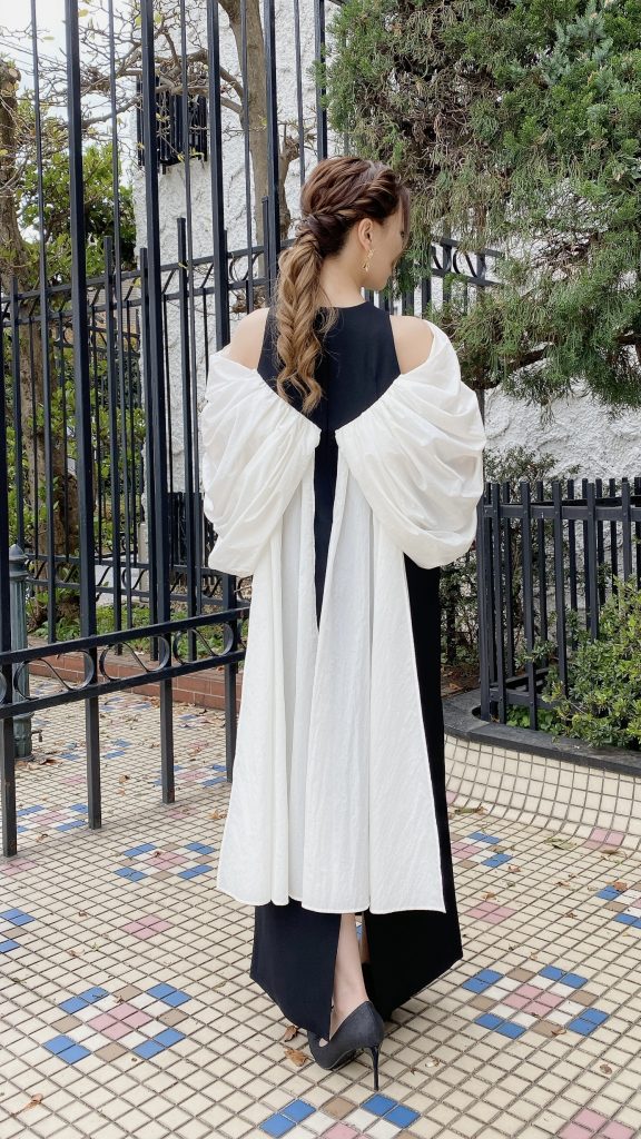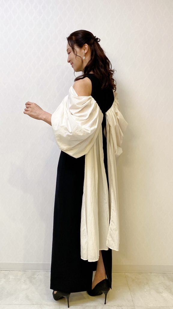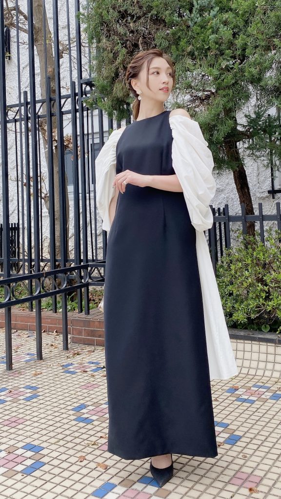 ブラックはブルーと違って、リボン部分がホワイトになっております。白と黒のコントラストが効いた、格好いいモードなドレスは、幅広い年代の方からご好評をいただいております👌