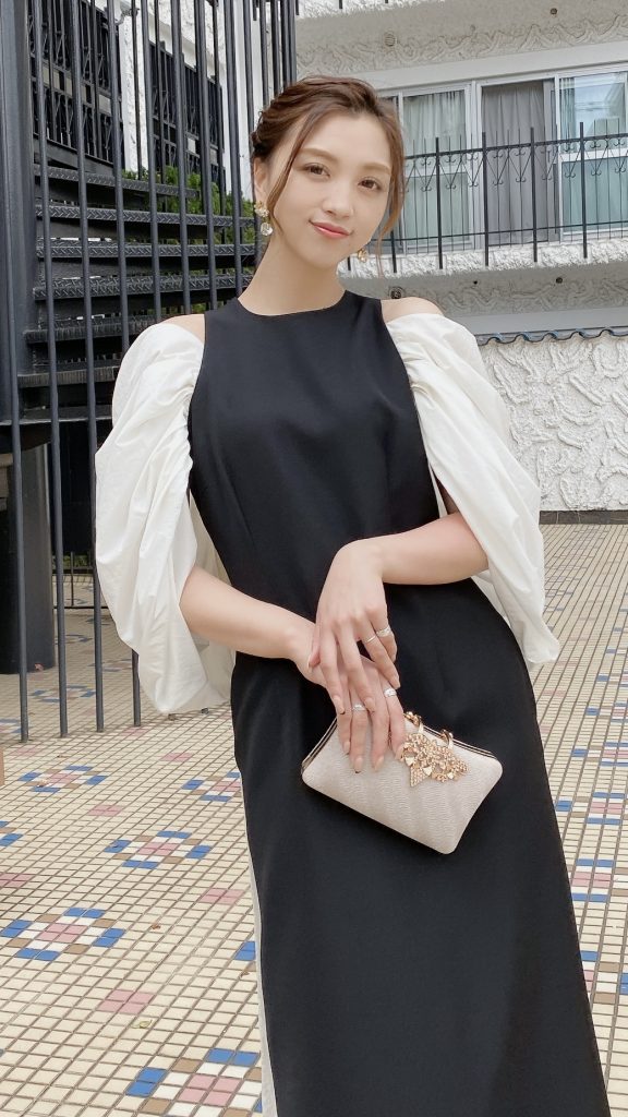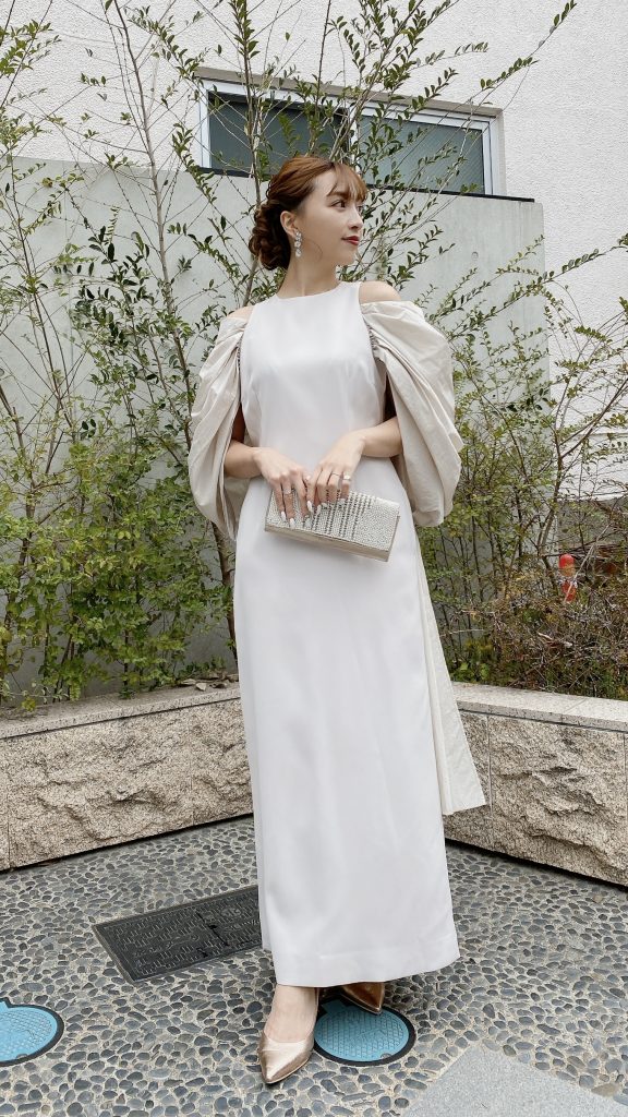 パレスホテルでの友人の結婚式参列用に、こちらをお借りしました。挙式の際には、試着時に店員さんが教えてくれた方法で腕を隠して着用、披露宴ではオープンショルダーで楽しみました。この度は、終始ご丁寧にご対応頂きましてありがとうございました。