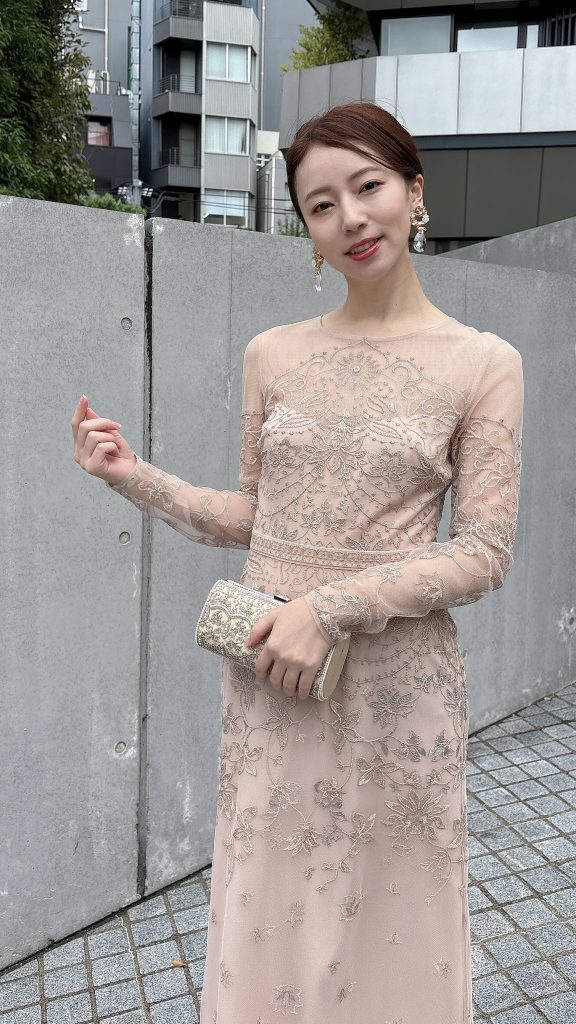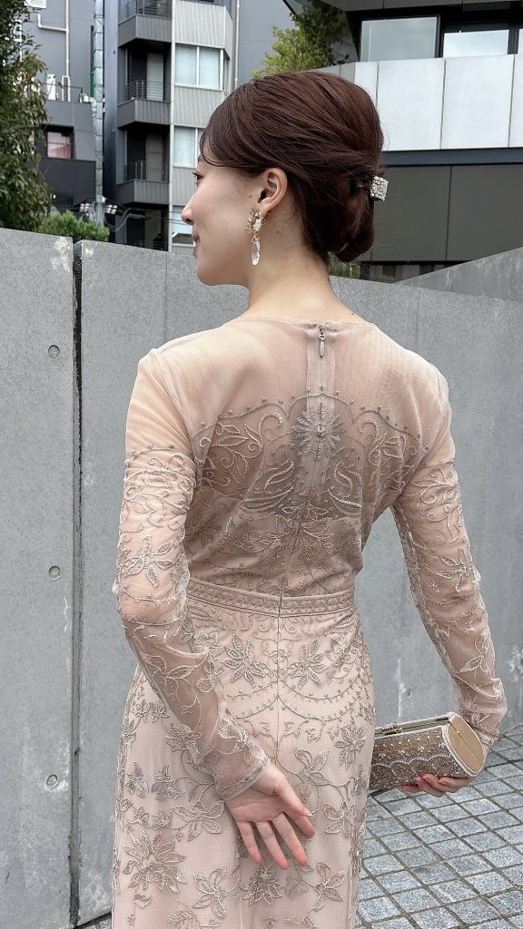 そんなBCBGよりイブニングドレスでは珍しい、長袖タイプのドレスが新入荷しました。 淡いピンクベージュカラーに繊細かつ華やかな刺繍が入ったチュール素材が使われており、とても上品な印象です✨