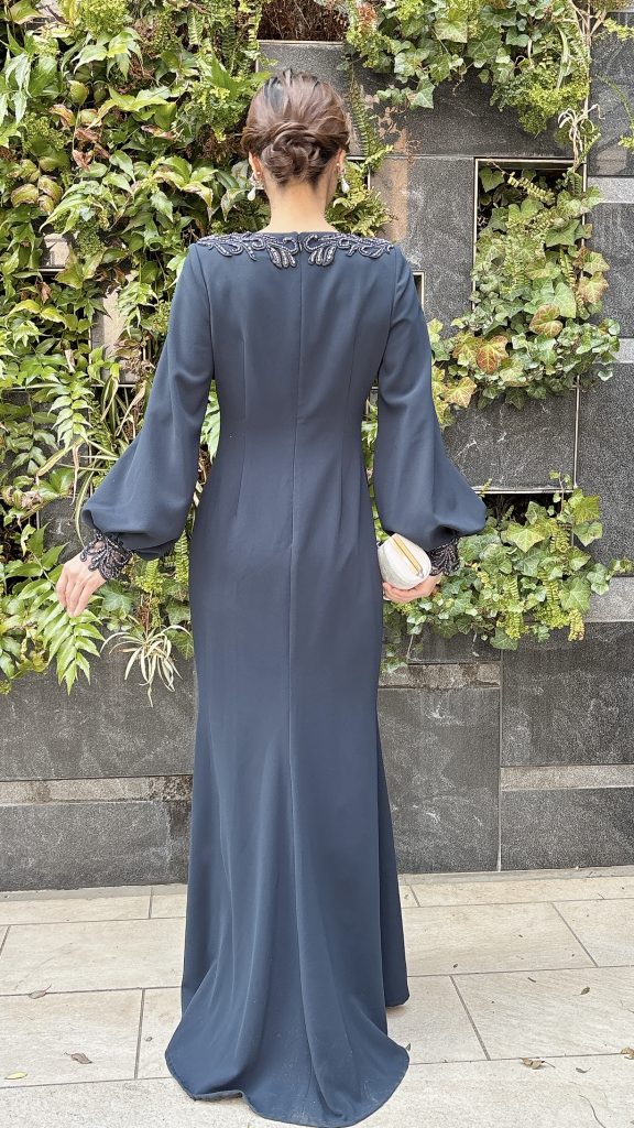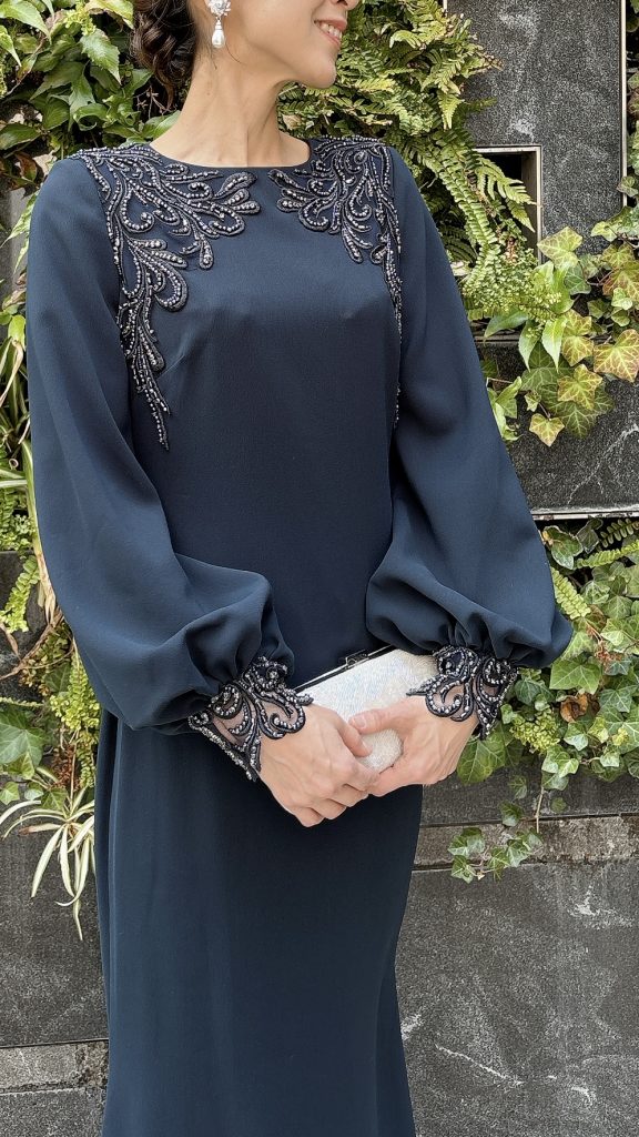 特徴的な刺繍が施されたデザインが、ドレス全体に華やかさを添えています。ビーズ刺繍は首元と袖口に美しく配置されており、ぽてっとしたボリュームのあるお袖など、細部にまでこだわりが感じられます🥀