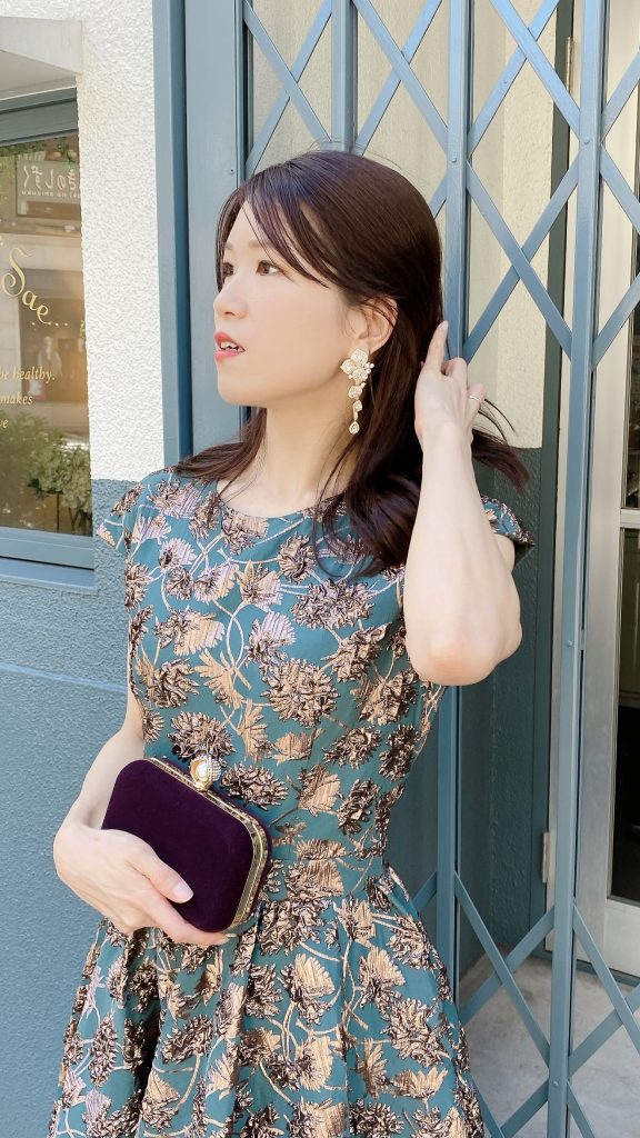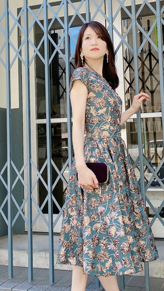 深いグリーンに立体的なお花柄がとても上品で、照明の下でさりげなく輝く感じも素敵でした。フィット&フレアのシルエットでスタイルよく見えたし、動くたびにスカートがふんわり揺れて、写真映えもしたかな。