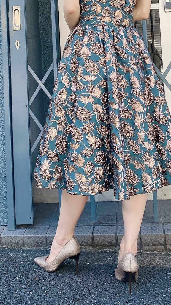 深いグリーンに立体的なお花柄がとても上品で、照明の下でさりげなく輝く感じも素敵でした。フィット&フレアのシルエットでスタイルよく見えたし、動くたびにスカートがふんわり揺れて、写真映えもしたかな。
