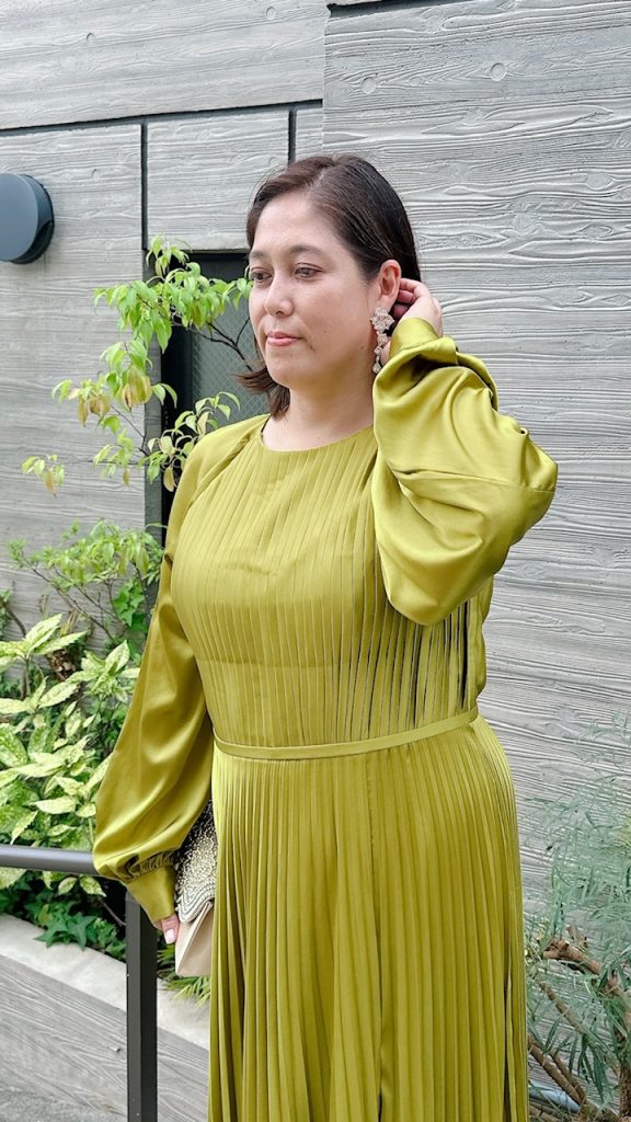 結婚式やホテルでのレセプション、アワードパーティーなど、格式あるシーンにもおすすめ。トレンド感のあるオリーブトーンが肌なじみよく、シーズンを問わずお召しいただけますよ🌸