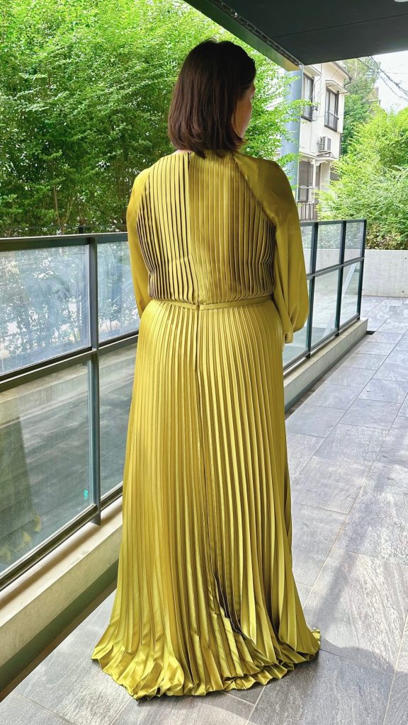 そこちらのドレスは、絶妙なイエローがかったオリーブカラーが印象的なロングドレスです👗動くたびに美しく揺れるプリーツデザインが、まるで風を纏うような軽やかさを演出します。