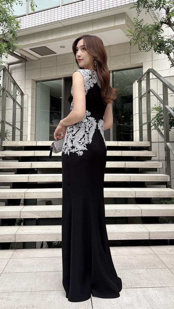 上半身からウエストにかけて施された華やかな刺繍が立体感を生み出し、女性らしいメリハリのあるシルエットを演出します。背中からヒップラインにかけて流れるようなデザインは、後ろ姿まで優美に見せてくれるポイント。