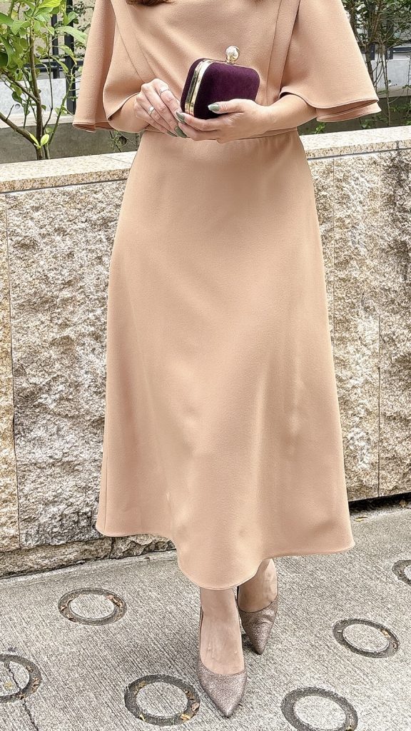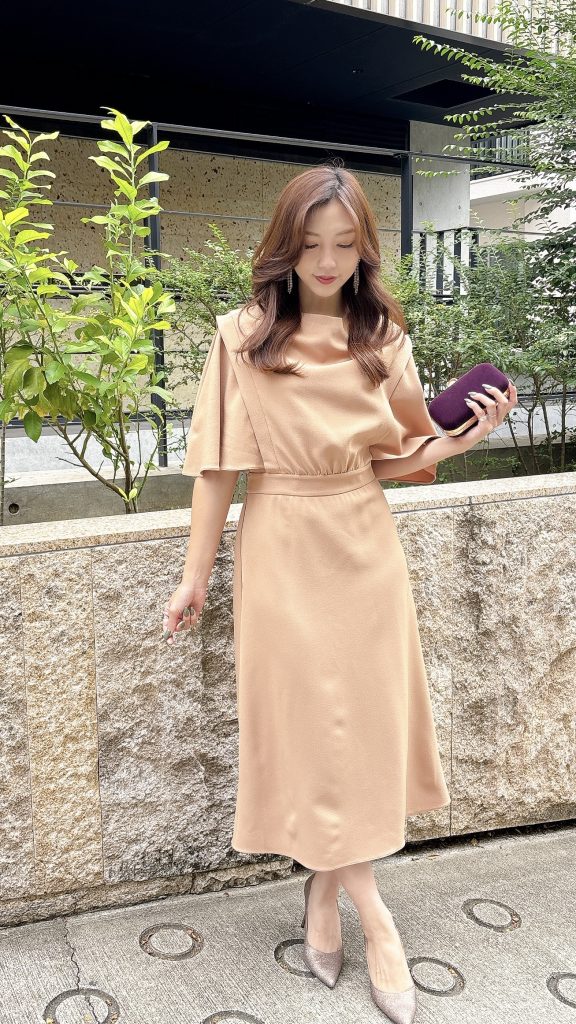 結婚式のお呼ばれやパーティーで周りと差がつく一着として、ドレスレンタルでも非常に人気の高いデザインです。ナチュラルなカラーながら存在感があり、アクセサリー次第で上品にも華やかにも着こなせる、幅広く活躍するドレスです。