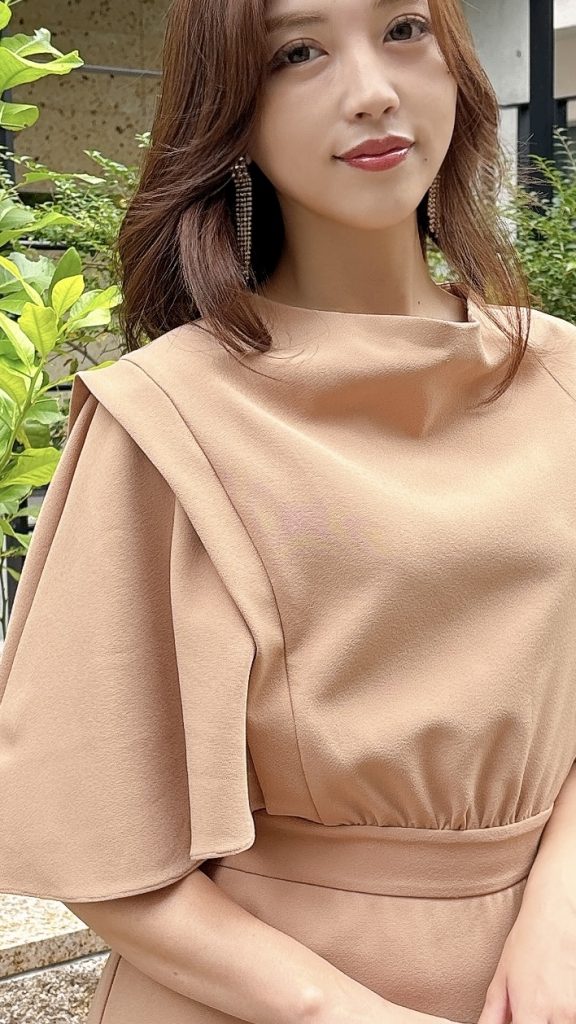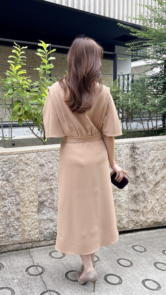サフィヤらしい上品さが引き立つキャメルベージュカラーの一着。柔らかく落ち感のある生地がボディラインを美しく包み込み、首元にゆったりと drape(ドレープ)を寄せたデザインが、顔まわりを華やかに演出します。ケープのように広がるスリーブは腕を自然にカバーしつつ、動くたびに優雅に揺れる女性らしいシルエットを作り出します。ウエスト位置が程よくマークされているため、スタイルアップ効果も抜群。