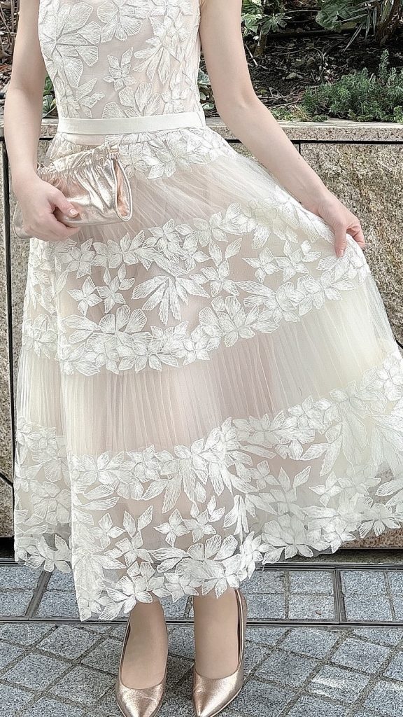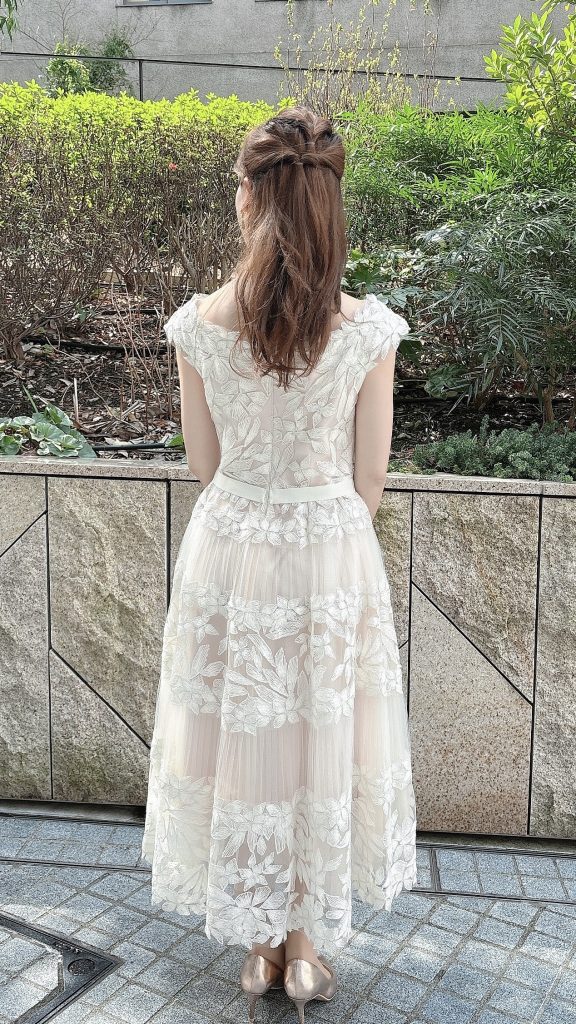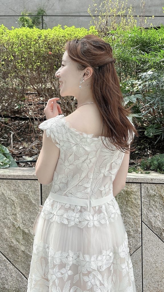 ウエストをすっきり見せるシルエットでスタイルアップ効果も抜群。上品さと華やかさを両立した特別感のある一着は、レンタルドレスで“周りと差がつく”コーデを叶えたい方にぴったり。大人の可愛さを最大限に引き出す、自信を持っておすすめできる名品ドレスです。