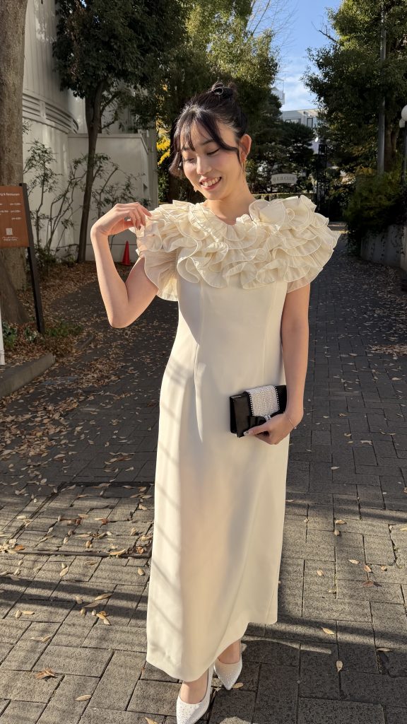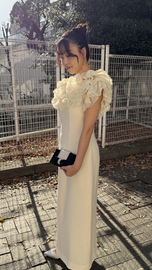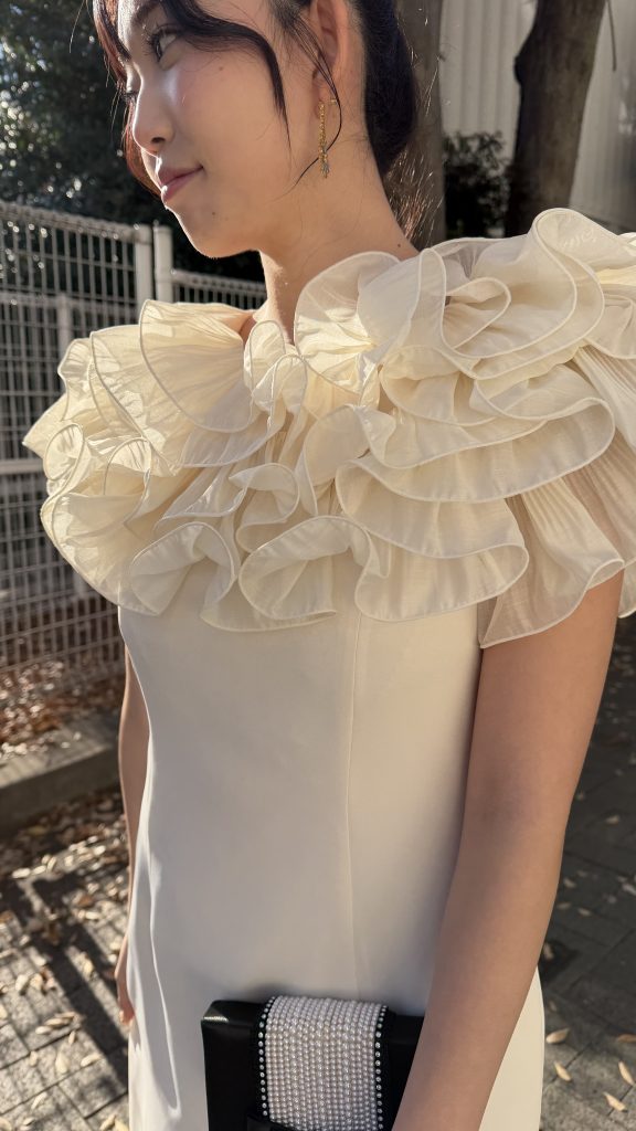 顔まわりを華やかに彩る立体的なフリルが特徴で、写真映えはもちろん、結婚式や二次会、パーティーなどフォーマルなシーンに最適な一着。縦のラインを強調したシルエットで、すっきりと大人っぽい印象を演出します。