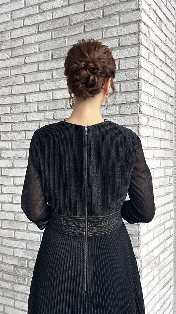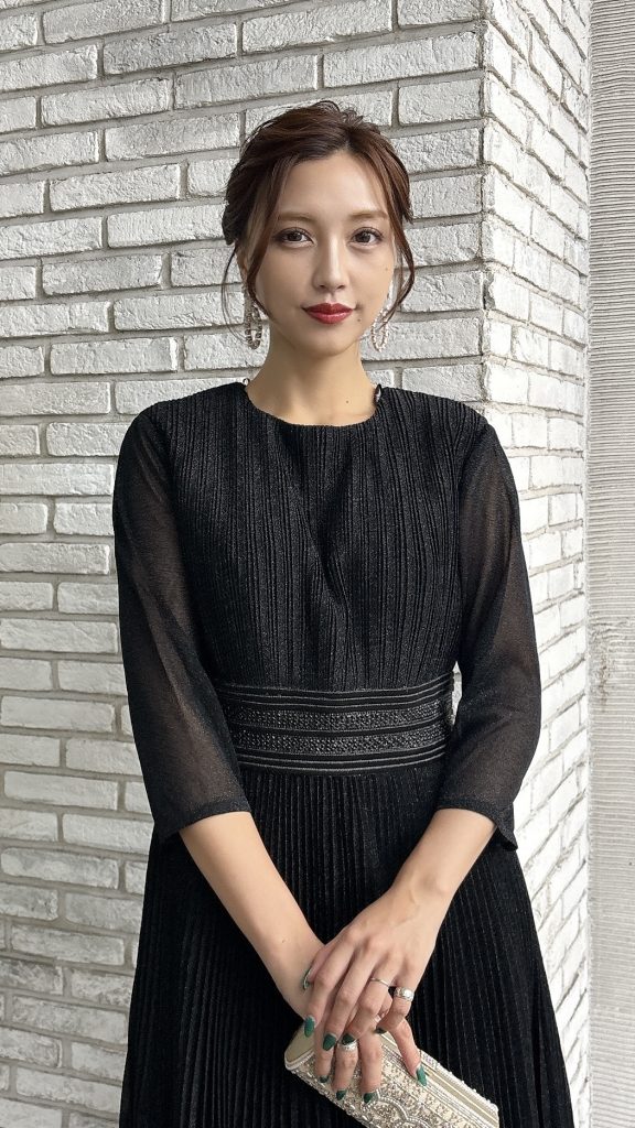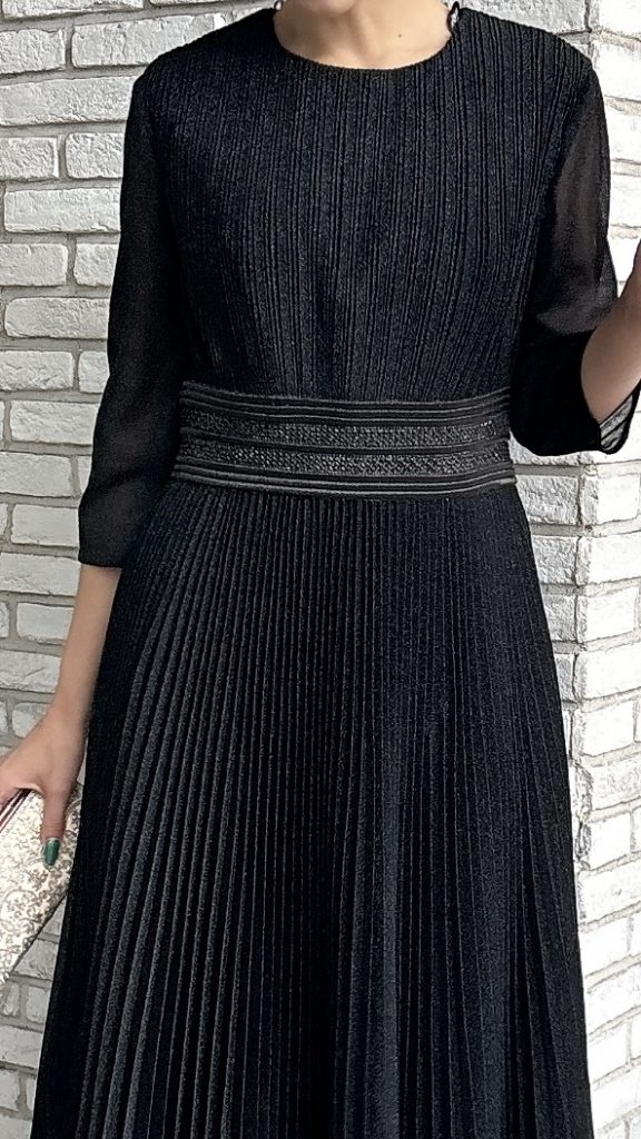 こちらのドレスは、ウエストの装飾が印象的な黒のロングドレスです。動くたびに美しく揺れるプリーツデザインが、まるで風を纏うような軽やかさを演出します。
