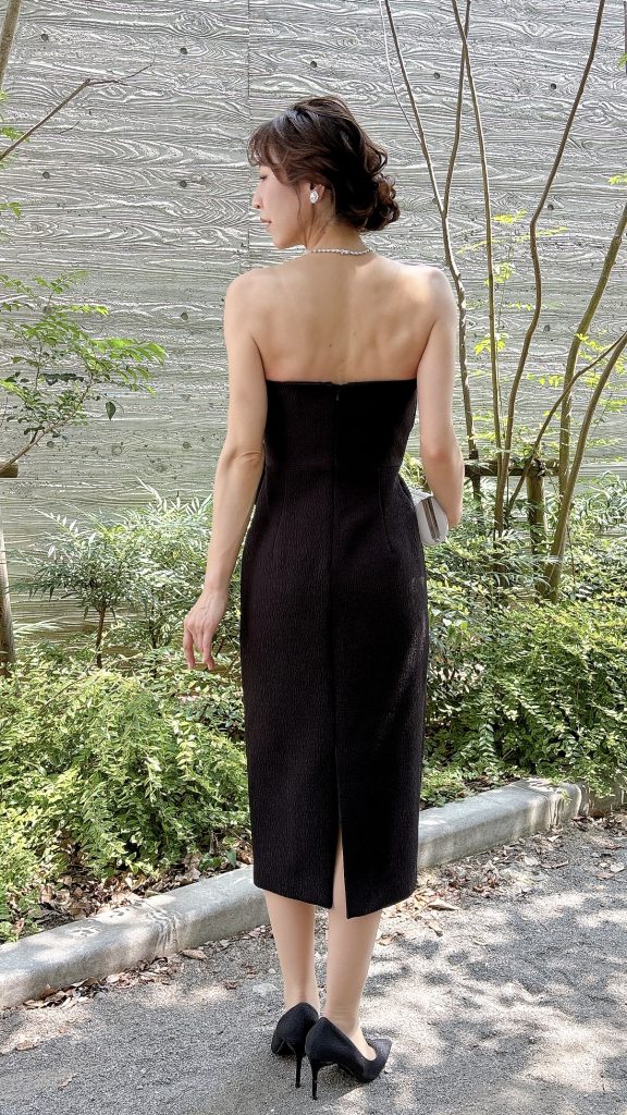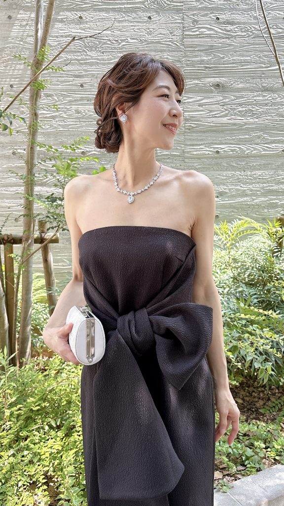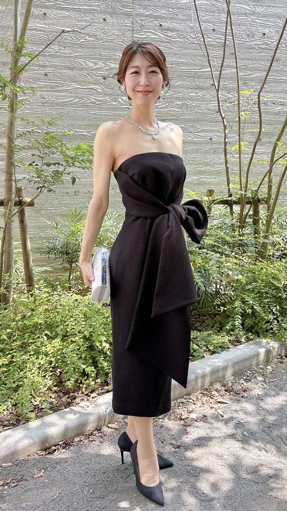 ウエスト位置が高めなので、スタイルがすごく良く見えました。ブラックですが重たく見えず、会場でもとても上品な印象でした。
