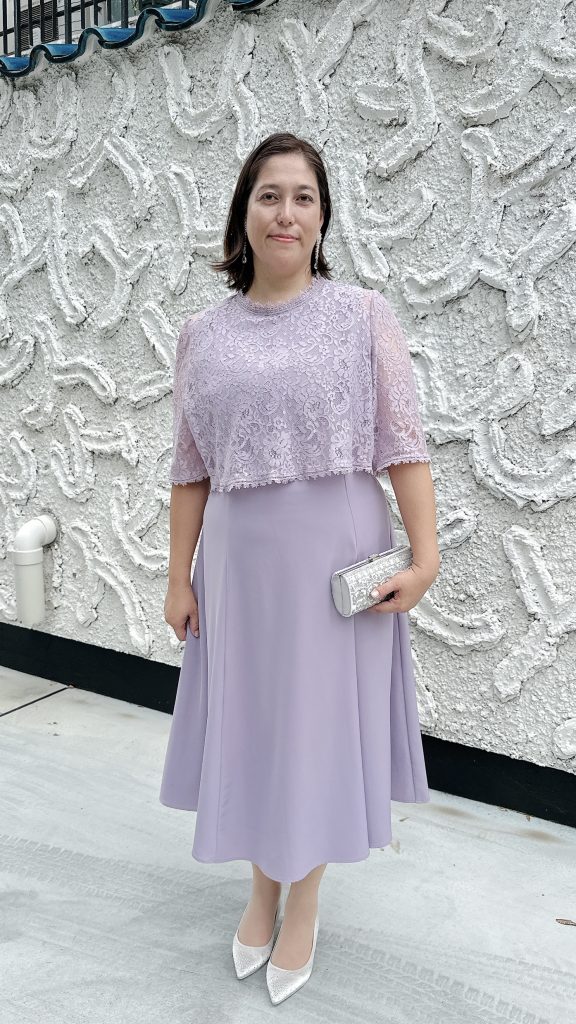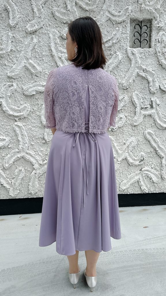 幅ひろい年齢層に対応可能な、ドレスティークの淡いパープルのケープドレスをご紹介します🪻