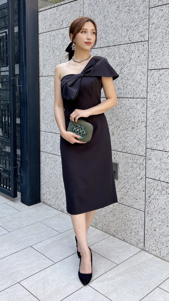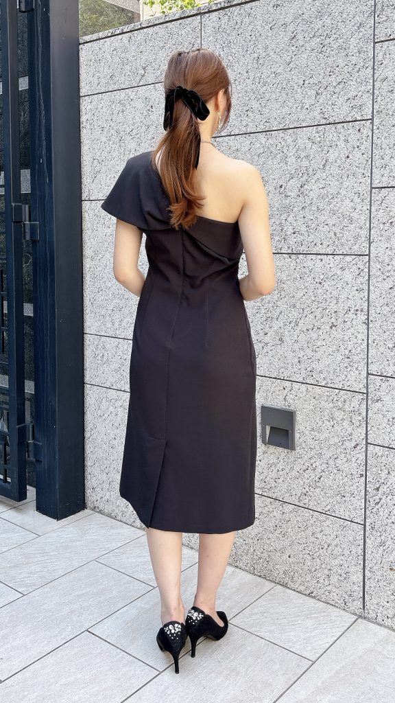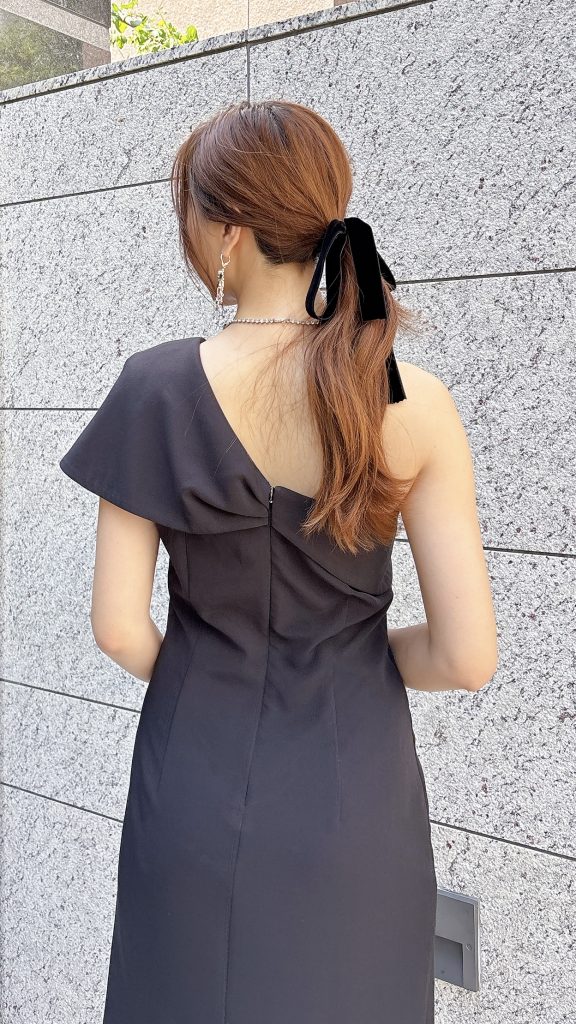 デコルテを美しく見せてくれるワンショルダーデザインに、胸元のリボン風ディテールが印象的なデザイン👗シンプルなシルエットの中に程よいデザイン性があり、モード感と女性らしさをバランス良く兼ね備えています。
