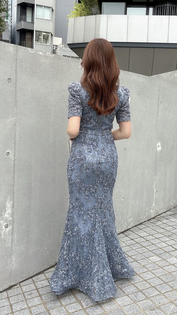 シルエットは身体のラインに寄り添うマーメイド寄りのデザインで、ウエストからヒップにかけてはすっきりと、裾に向かって自然に広がるフォルムが特徴です。動くたびに表情の変わるラインが魅力で、全体のバランスを美しく整えてくれます。半袖仕様のため、露出を控えたい方にも取り入れやすく、特別な日の装いとして幅広く選ばれている一着です。「総レース ドレス レンタル」「結婚式 お呼ばれ ロングドレス」「ブルーグレー ドレス」などのキーワードでお探しの方にもおすすめです。
