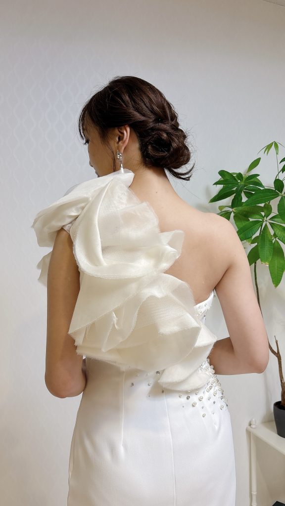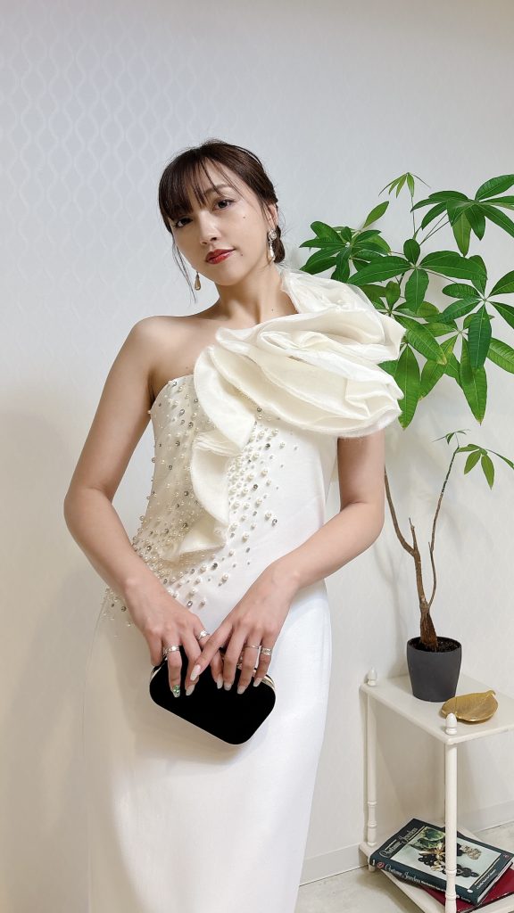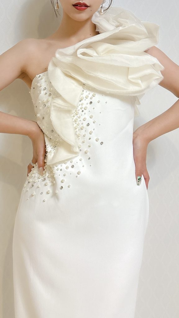 立体感のあるモチーフが目を惹くワンショルダーデザインが、デコルテ周りを華やかに演出。身頃には繊細なビジューやパール装飾が施され、動くたびに上品な輝きを放ちます✨