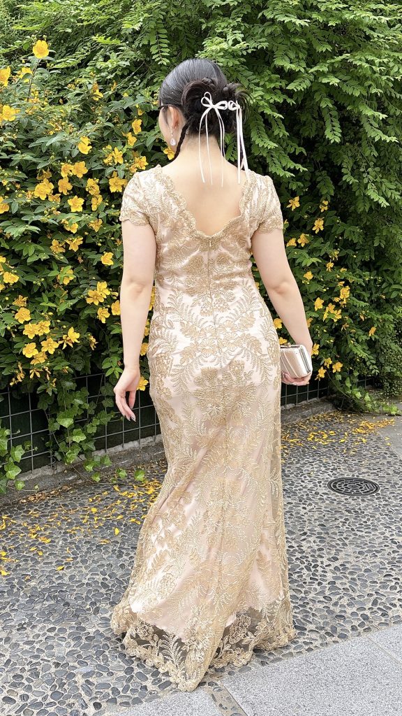 品のある淡いゴールドベージュカラーで、会社イベントやガラパーティーなど、きちんと感が求められるシーンにも安心してお召しいただけます◎