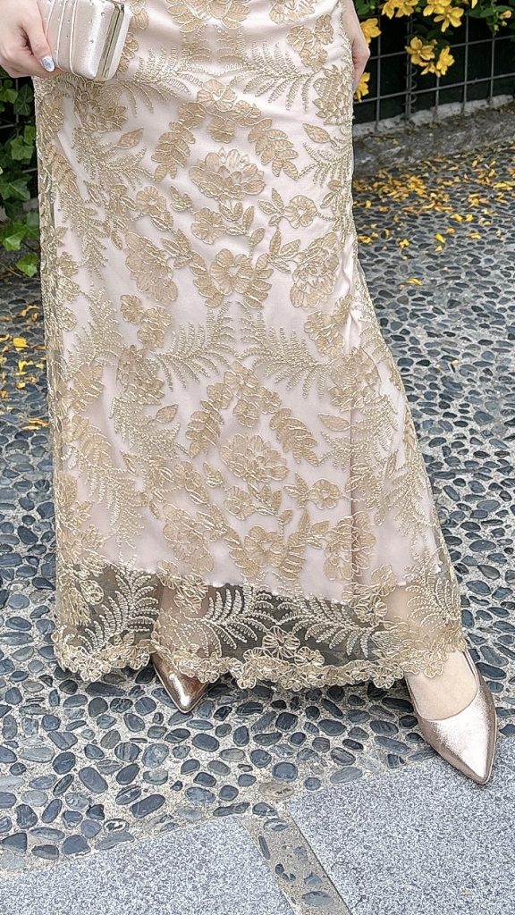 品のある淡いゴールドベージュカラーで、会社イベントやガラパーティーなど、きちんと感が求められるシーンにも安心してお召しいただけます◎