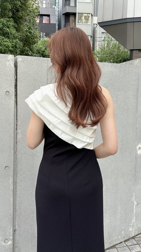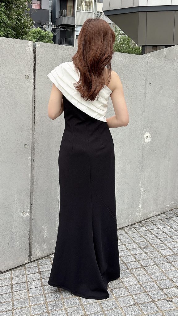 ブラック×ホワイトのコントラストが目を引く一着で、シンプルながらも存在感のあるデザインが魅力。立体的に重ねられたホワイトプリーツのワンショルダーデザインが視線を上に集め、すっきりとした縦ラインを演出します。生地には程よく厚みがあり、ラインを拾いすぎないため、体型カバー力抜群です✨