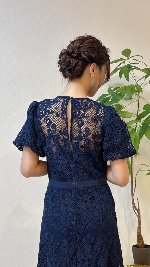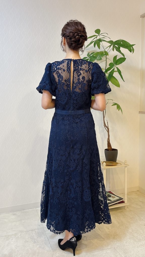 ネイビーカラーと、キュートなパフスリーブに揺れ動くデザインが特徴のこちら。レースの透け感がエレガントなドレスは、周りと差が付くレンタルならではの唯一無二の1着です♪
