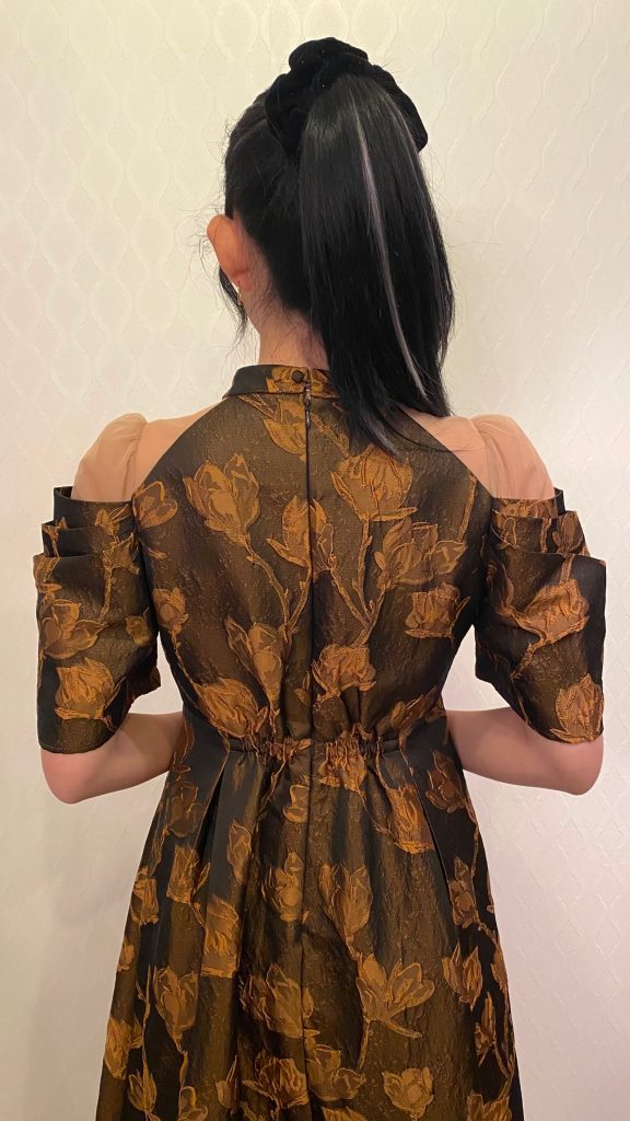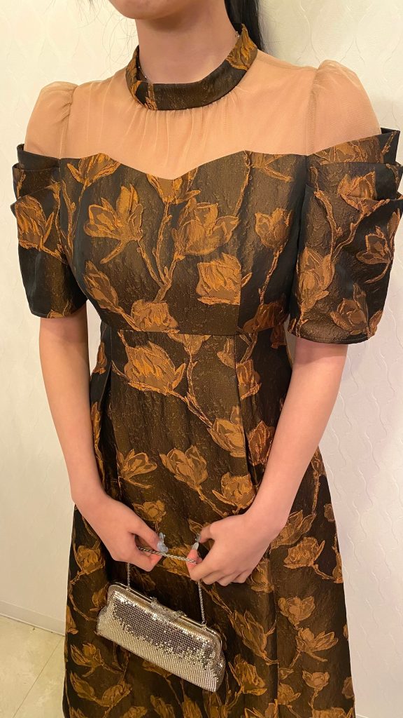 ボリュームがあってメリハリも出せますし、茶色の中にお花のデザインが可愛い個性を出せる唯一無二のドレスとなっております。