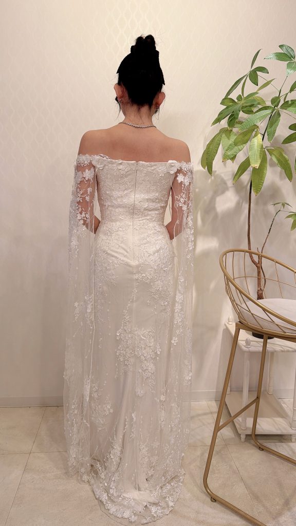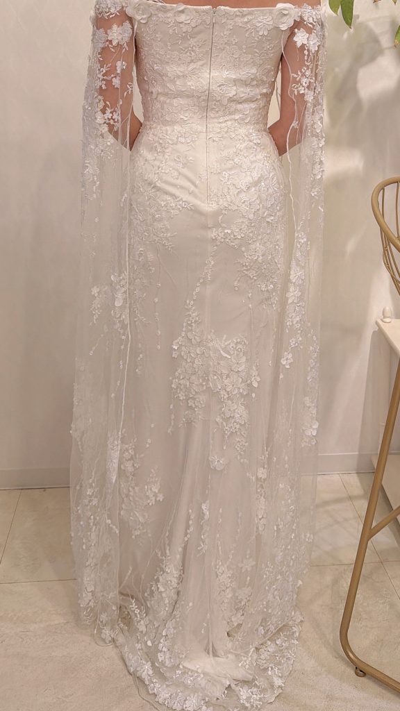 ずっとボリュームのないタイトめなシンプルの物を探していて、こちらのドレスは形もすごく綺麗に見せてくれるし、程よい抜け感が私好みでした。私は袖部分、肩にかけるような形で使用し肩から掛かるチュールがとても上品で素敵でした。