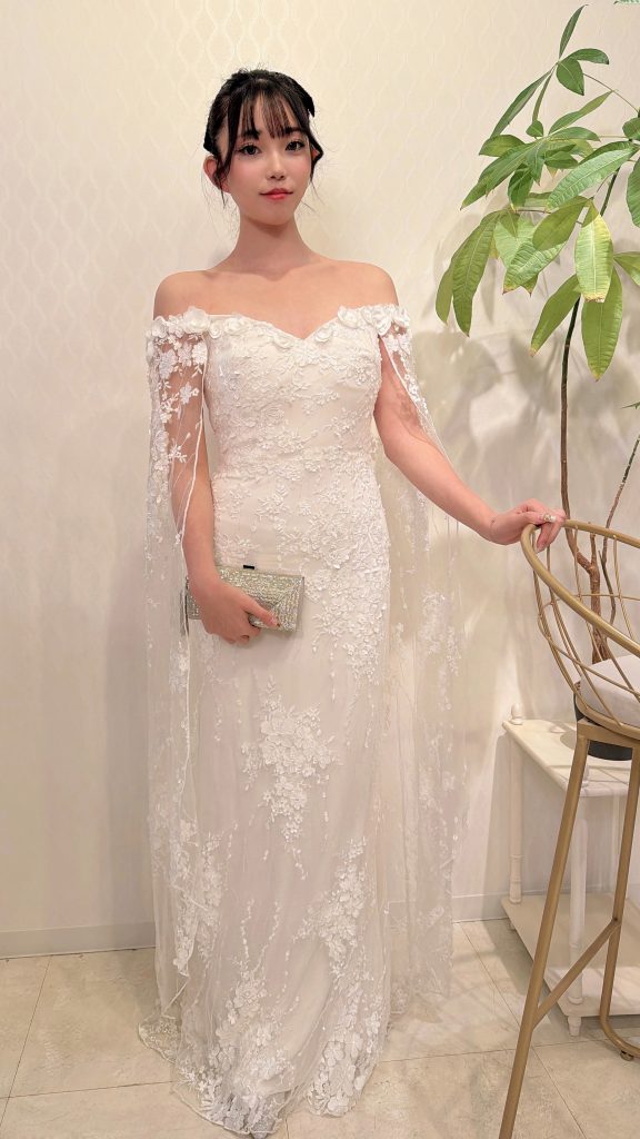 このドレスには楽しみ方が2通りあり、腕のチュール部分を肩に少し掛けて着ていただく事も出来ますし、逆に肩を落としオフショルのようにも着ていただける魅力たっぷりのドレスです。