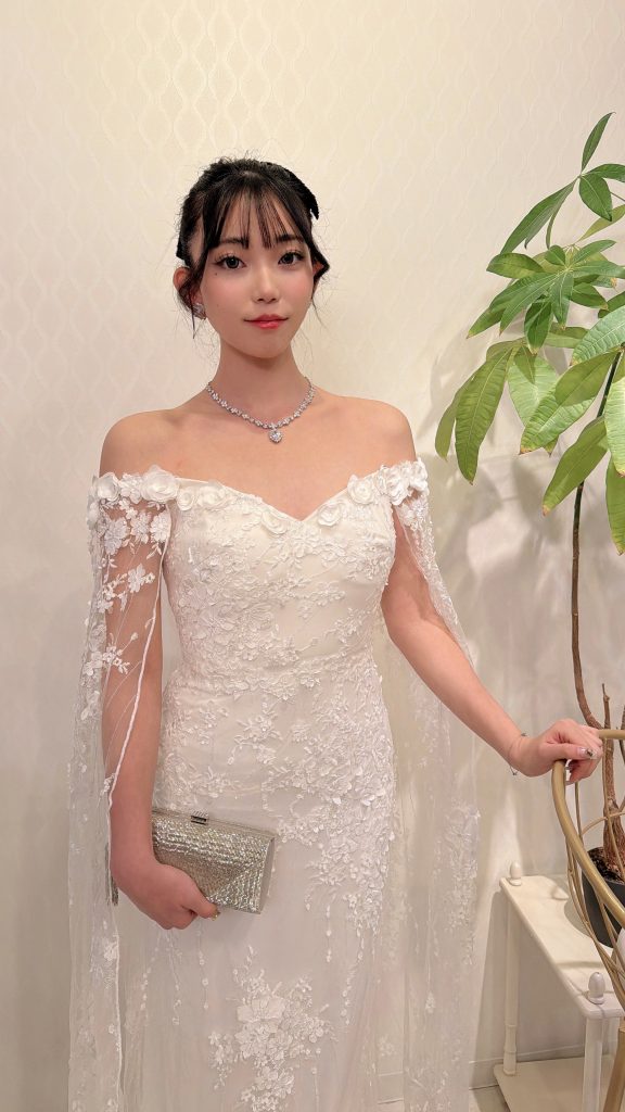 腕にかかるチュールは、まるで花嫁様のベールのようで美しさを引き出してくれます。
