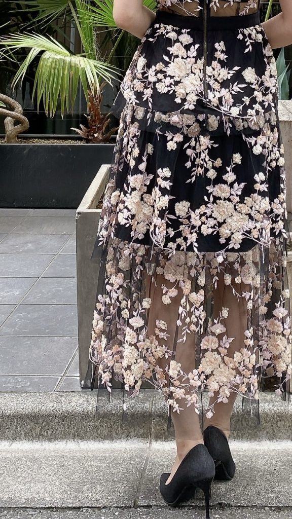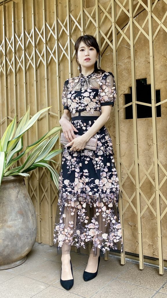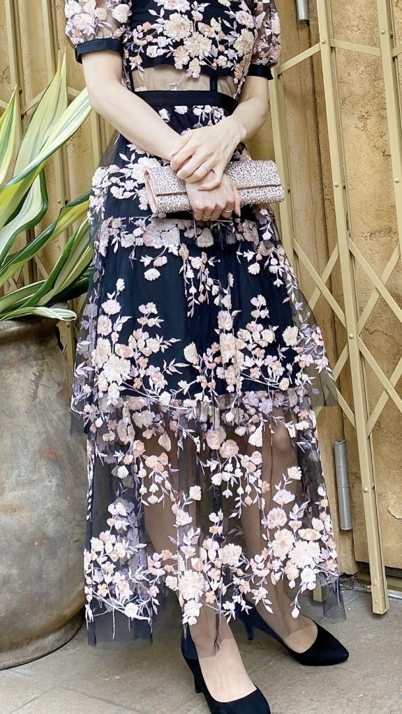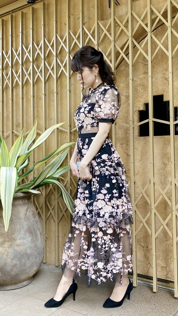 黒のチュールに、満開のお花を思わせるようなゴージャスなスパンコールデザイン。他の人とかぶらないザインで、主役のようなお呼ばれドレスをお探しの方に一押しです♪ ミモレ丈ということもあり、よりドレッシーさが演出され、セルフポートレート独特な世界観をも堪能していただける1着です。