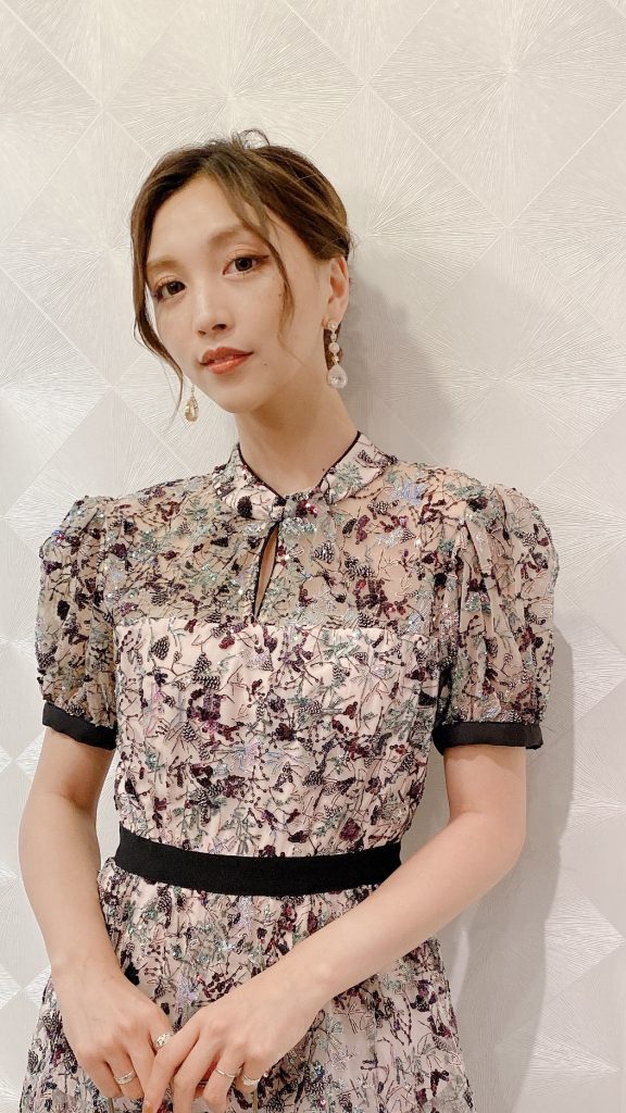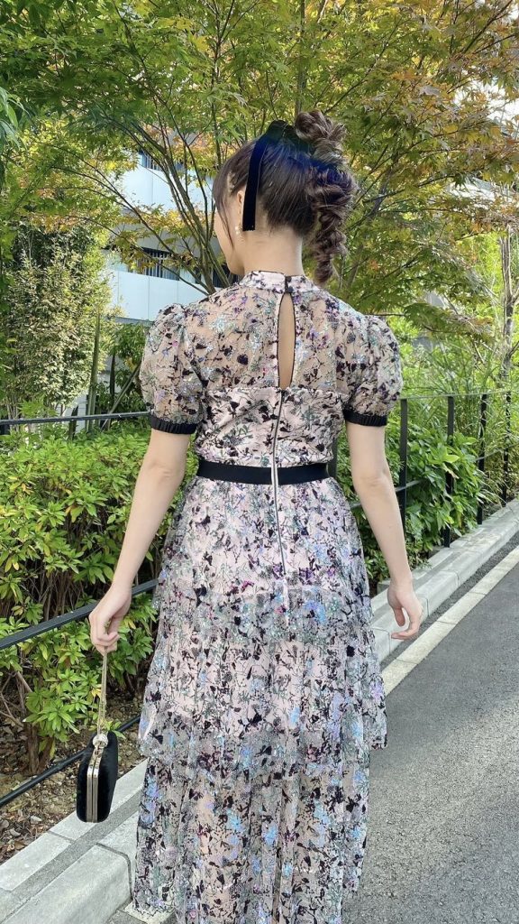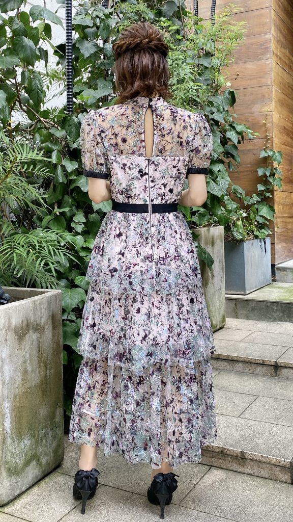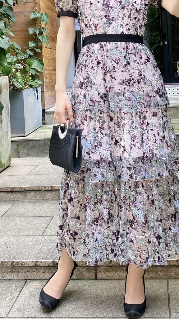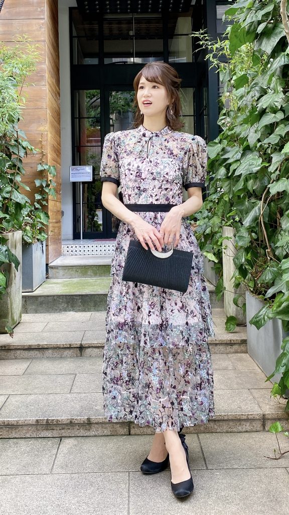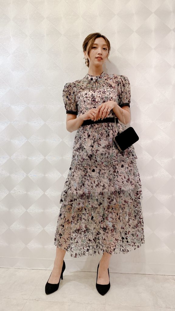 こちらのドレスは一枚羽織るだけで充分華やかなので、靴や鞄はブラックに、耳元のアクセサリーも控えめでシンプルなものを合わせて頂のがオススメです◎
