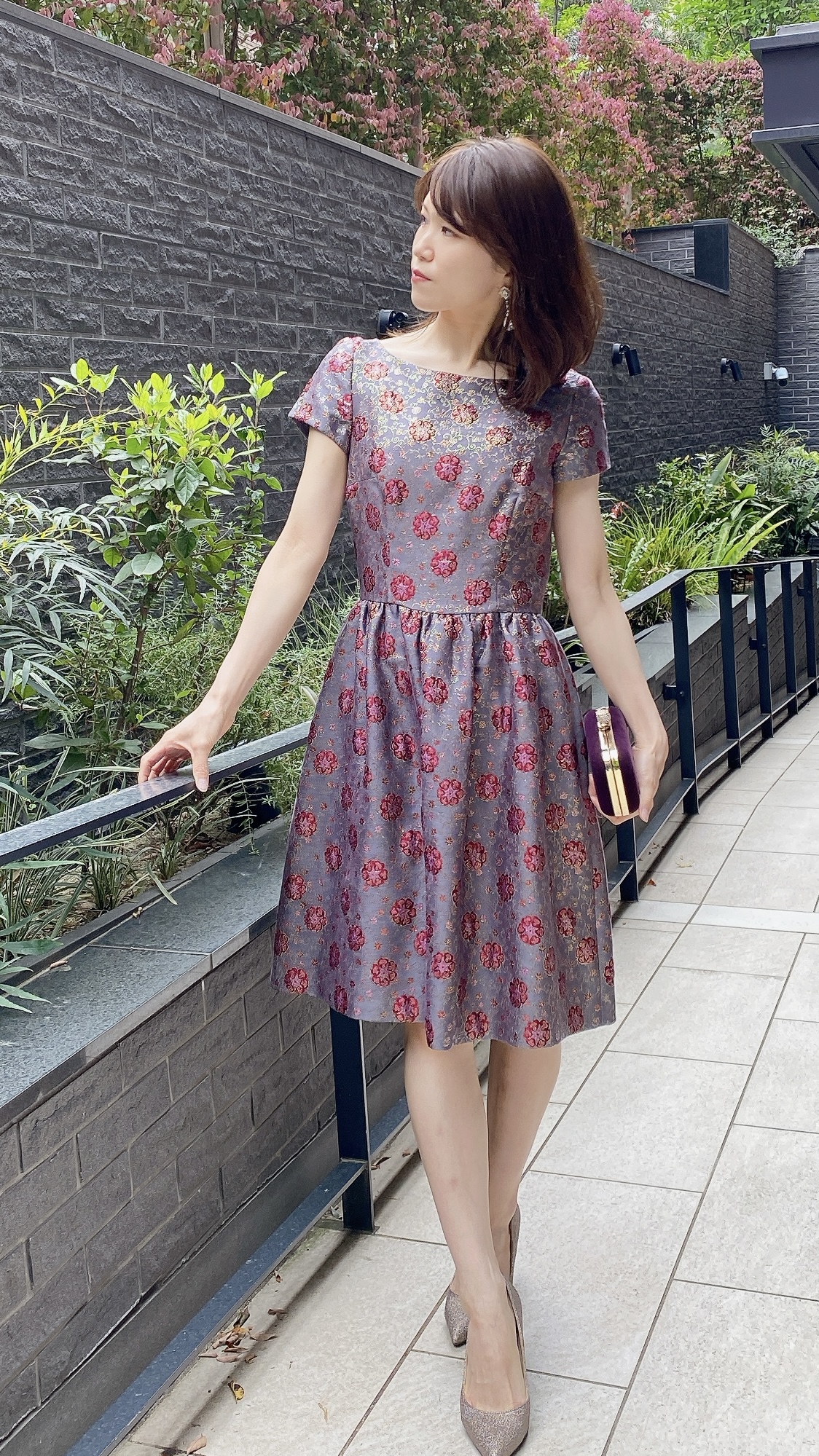 綺麗なラインのフィット&フレアで王道に可愛いシルエット♡ゴールド地にベビーピンクのお花柄がフェミニンでありながら品の良さも演出...more